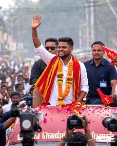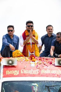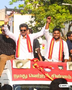 Capture an ultrarealistic 8K photograph (4:5 aspect ratio) of two South Indian men at a political roadshow under bright, warm sunlight. Utilise an 85mm cinematic lens style with a shallow depth of field, mimicking an ARRI Alexa or RED V-Raptor capture, ensuring realistic shadows, highlights, skin tones, and fabric textures with no noise or artefacts.Person A@img1 (left) must have 100% identity lock to the original image, preserving his face, hairstyle, salt-and-pepper beard, sunglasses, expression, outfit, and red-and-yellow flower garland without any modifications.Replace Person B@img1 (right) in the reference image with my own image@img2 that I uploaded, which must also have 100% identity lock, maintaining his hairstyle, facial hair, skin tone, and expression. He should wear a white linen shirt, beige pants, and the same red-and-yellow scarf from the reference image, accurately replicating its colour, pattern, fabric texture, and draping. He should naturally hold and raise Person A’s hand.Both men should stand closely, posing confidently. The environment (road, crowd, security) should remain unchanged, providing realistic depth with a slightly blurred background.Negative Prompt: No alterations to Person A; no changes to the garland, accessories, or sunglasses; no identity distortion; they must be touching hands; no blurriness except in the background; high quality only; no cartoon, CGl, or painting effects; no face morphing, extra limbs, or duplicate faces; ensure realistic lighting; no HDR; no over-sharpening; no watermarks, text, or logos.